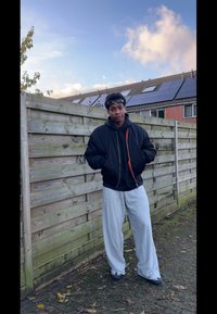 • Čierna bomber bunda so zapínaním na zips vpredu, rebrovanými manžetami a voľným strihom, preložená cez čiernu mikinu, v kombinácii so šedými teplákmi.