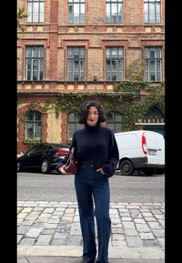 • Žena s kučeravými tmavými vlasmi má na sebe tmavomodrý rebrovaný rolák,štíhle nohavice, čierne topánky a drží v ruke vínovú koženú kabelku, stojí vonku.