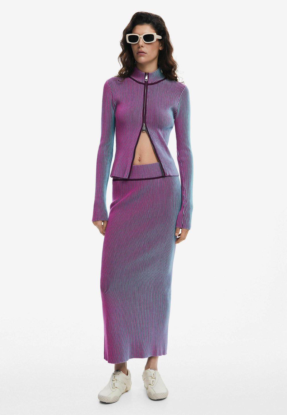 Farebný pletený cardigan so zipsom vpredu a dlhými rukávmi, kombinovaný s tmavými širokými džínsami a metalickými topánkami, stojac pri vode.