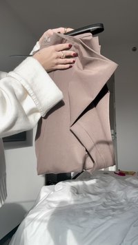 béžový trenčkot, krémový svetr s pleteným vzorem, hnědá mini sukně s pásem, světle hnědé kozačky po kolena, držící hnědou kabelku, stojící na bílé koberce.