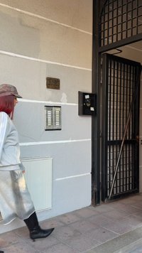 • Žena s červenými vlasmi, oblečená v sivej kockovanej šiltovke, svetlosivej bundě Adidas, širokých sivých nohaviciach a čiernych špicatých čižmách, stojaca pri kovovej bráne.