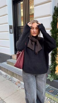 • Čierny nadýchaný sveter so širokými rukávmi, sivé široké nohavice a tmavohnedý šál. Drží zapletenú bordovú tašku. Mestské pozadie.