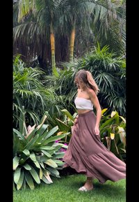 • Žena v bielom trubkovom topu a dlhej hnedej sukni kráča po tráve, obklopená tropickými rastlinami a fialovými kvetmi.