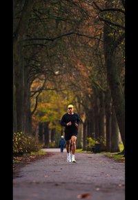 • Atlét nosiaci čierne tričko s dlhým rukávom a čierne šortky, bežiaci po ceste lemovanej stromami. Biele a farebné športové topánky, žltá čiapka.