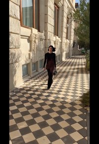 • Žena s krátkymi čiernymi vlasmi pózujúca so zavretými očami, oblečená v bordovej čipkovanej šatke cez čierne tričko s dlhým rukávom, držiaca čiernu kabelku.