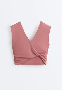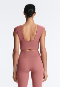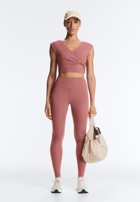 Žena v bledo ružovom zavinovacom crop tope a legínach s vysokým pásom, krémovej šiltovke, bielych teniskách, držiaca béžovú kabelku na jednoduchom pozadí.