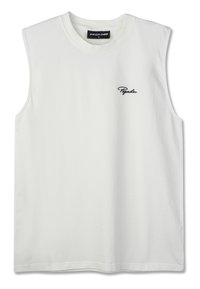 Čierne bezrukávové bavlnené tričko s okrúhlym výstrihom, s bielou vyšívkou loga na ľavej hrudi. Jednoduchý, rovný strih.