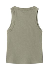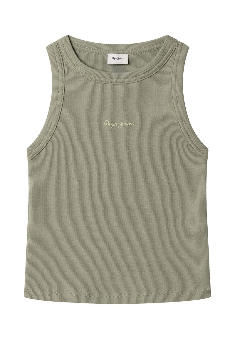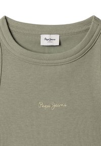 Bezrukávové rebrované svetlo olivovo zelené tielko s okrúhlym výstrihom a logom "Pepe Jeans" vyšité v malom svetložltom písme v strede.