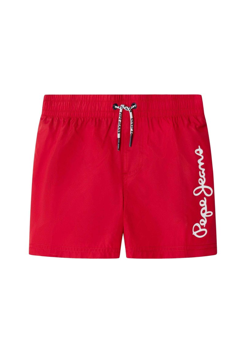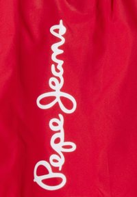 Červené plavkové šortky s elastickým pásom a čierno-bielym sťahovacím šnúrkou, s vertikálnym bielym logom "Pepe Jeans" na pravom stehne.