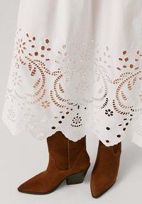 Žena v bielych midi šatách bez rukávov s kvetinovým výstrihom na leme a hnedými semišovými čižmami strednej dĺžky, stojaca pred jednofarebným pozadím.