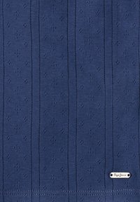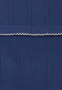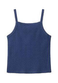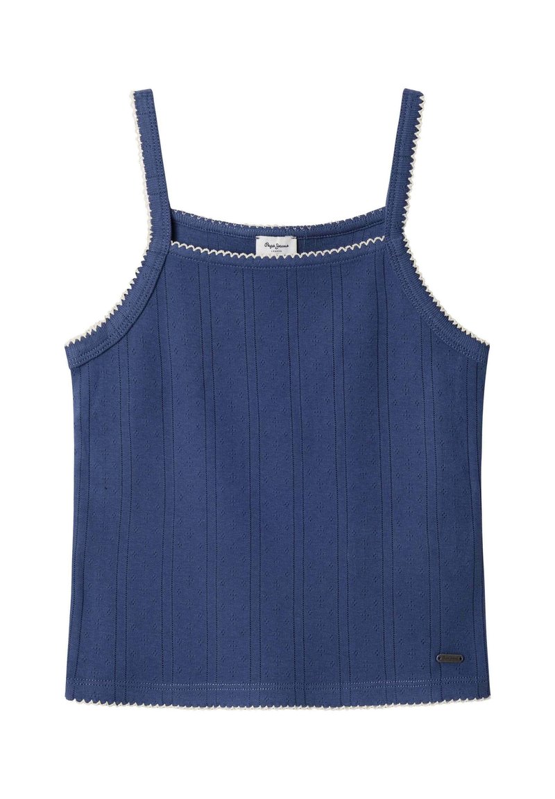 Námornícka modrá bavlnená tielková košieľka s úzkymi ramienkami, s textúrovanými vertikálnymi líniami a vlnkovaným lemom pozdĺž výstrihu a lemu.