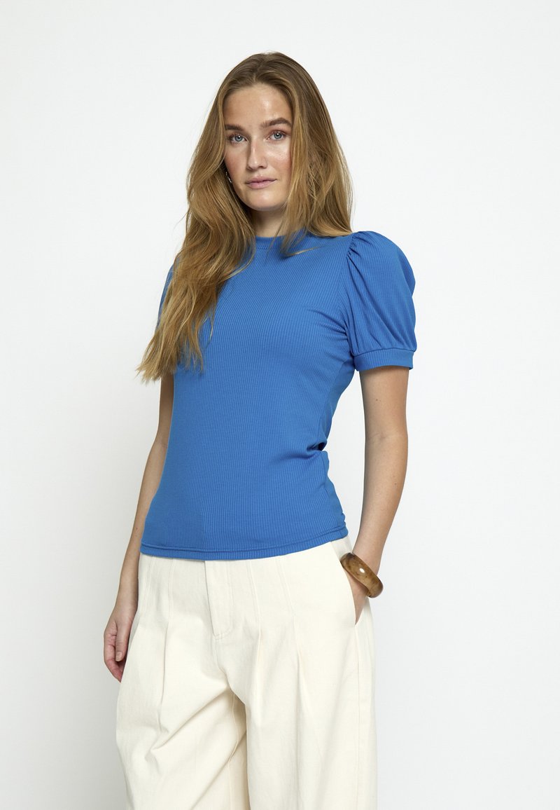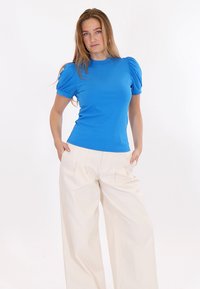 Žena s dlhými blond vlasmi, oblečená v modrom tričku s krátkym rukávom a bielych širokých nohaviciach, stojaca s jednou rukou v vrecku.
