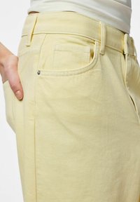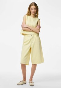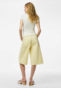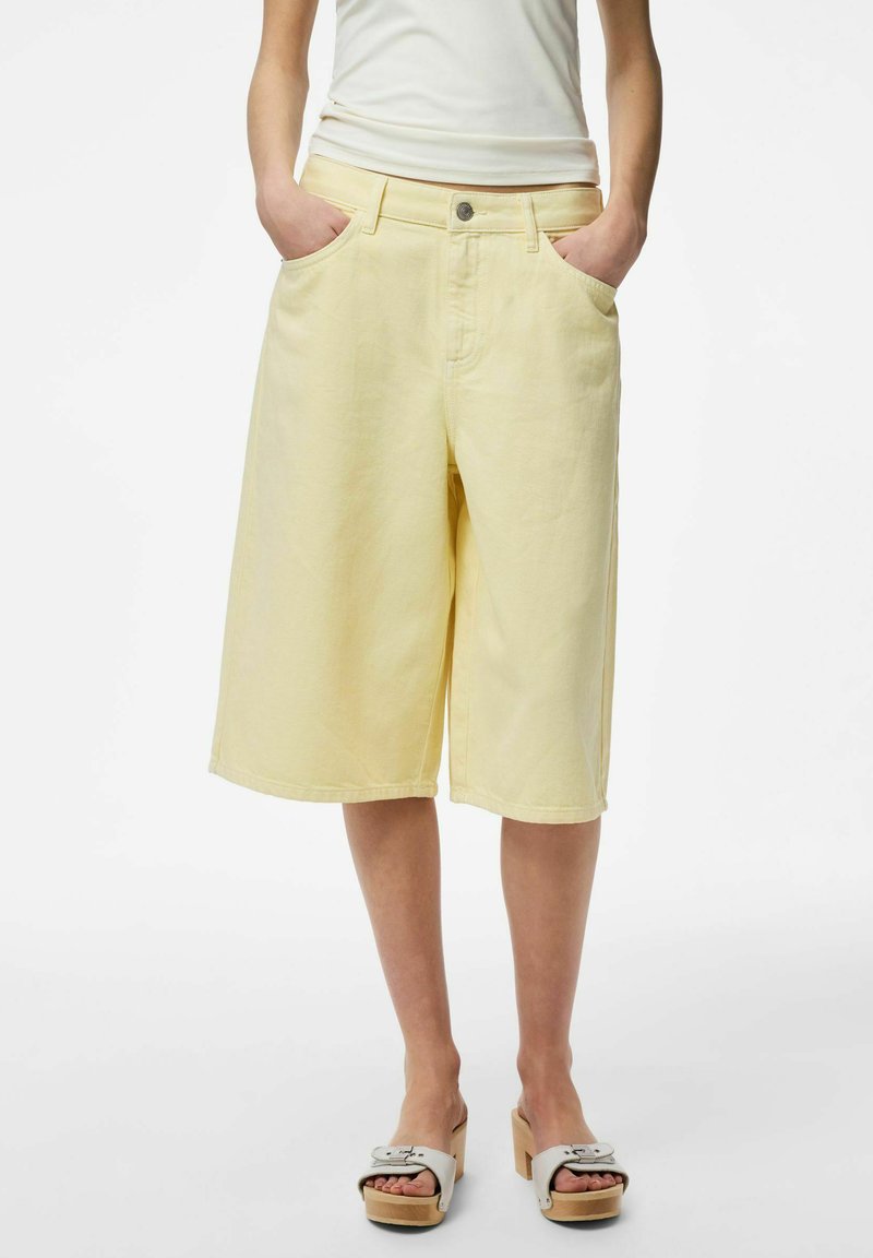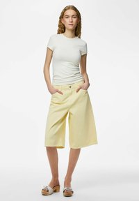 Osoba nosiaca voľné, do kolien siahajúce bledožlté šortky s rukami vo vreckách a béžové sandále na podpätku s detailmi na pracke.