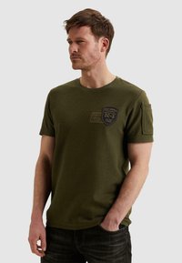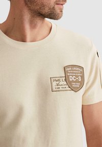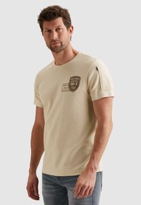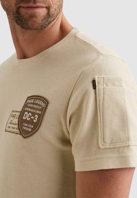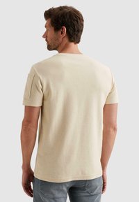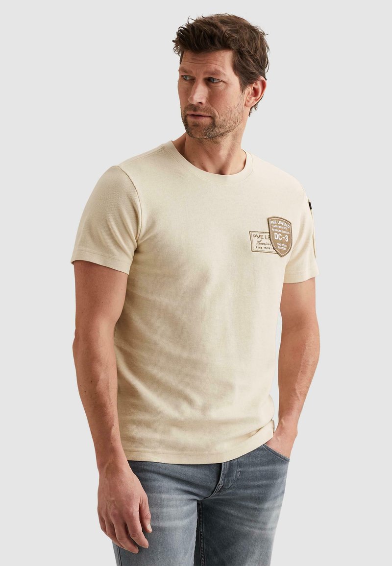 Muž v béžovej krátkosleeve košeli s nášivkami na hrudi a modrých džínsoch, stojaci s jednou rukou v vrecku, pozerajúci sa doľava.
