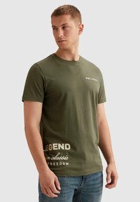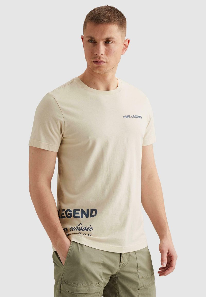 Mladý muž oblečený v béžovom tričku PME Legend a olivovo zelených cargo nohaviciach, stojaci s jednou rukou v vrecku, pozerajúci sa do strany.