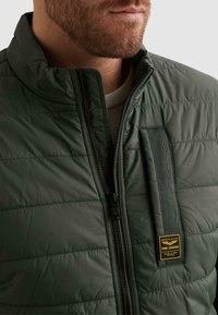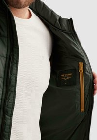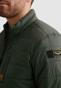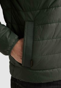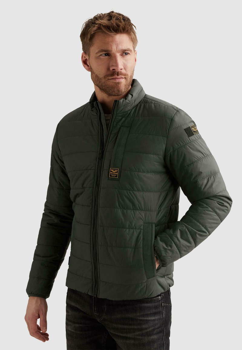 Muž oblečený v tmavozelenej prešívanej bunde s vysokým golierom a zipsom, stojaci s jednou rukou vrecku, pozerajúci sa do strany.