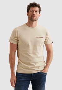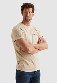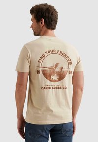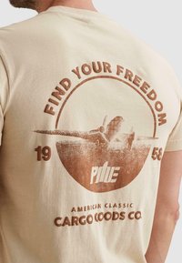 Muž nosiaci béžové tričko s grafikou vintage lietadla a textom „Find Your Freedom, 1958, American Classic, Cargo Goods Co.“ na chrbte.