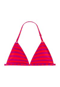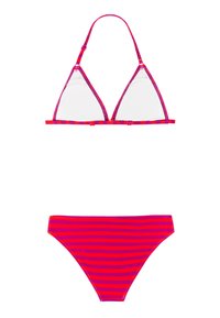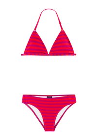 Červený a ružový horizontálne pruhovaný dvojdielny plavkový set s trojuholníkovým halter topom a zodpovedajúcimi nohavičkami s nízkym pásom na bielom pozadí.