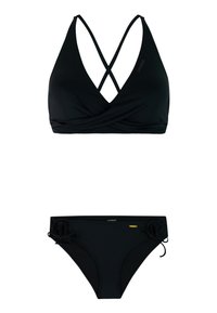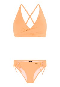 Svetloružový bikini set s prekríženým trojuholníkovým topom a nastaviteľnými bokmi s viazaním na boku, vyrobený z hladkej, pružnej látky.