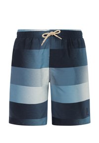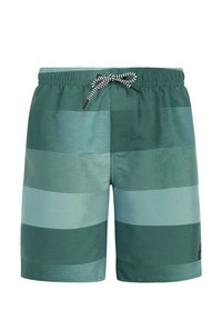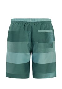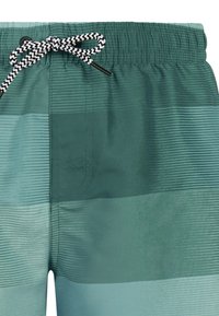 Plavkové šortky so zelenými a tyrkysovými pruhmi, s elastickým pásom a čierno-bielou šnúrkou vpredu so vzorom cikcak.