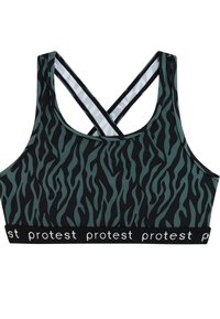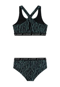 Dvojdielne plavky so zeleno-čiernym zebrovým vzorom, elastické pásiky s nápisom "protest", zložené z hornej časti s krížovým chrbtom a spodnej časti.
