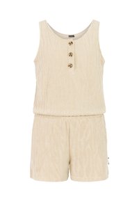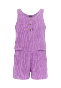 Fialový overal z terénnej látky s textúrovaným zebrovým vzorom, s okrúhlym výstrihom, tromi gombíkmi vpredu, elastickým pásom a dvoma bočnými vreckami.