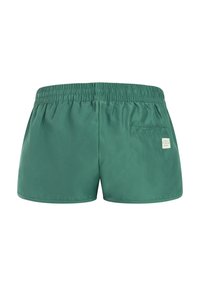 Žena v tyrkysových kraťasoch s elastickým pásom, šnúrkou a čipkovým lemom, stojaca naboso na bielom pozadí.