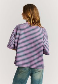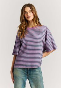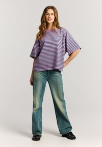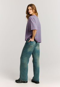 Mladá žena s dlhými vlnitými vlasmi, oblečená v voľnom fialovo-zelenom pruhovanom tričku a modrých džínsach, stojaca pred jednoduchým svetlým pozadím.