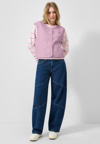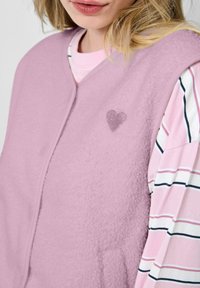 Mladá žena oblečená v svetlofialovej bezrukávovej flísovej veste cez ružovo-bielu pruhovanú blúzku s dlhými rukávmi a modré rifle, pozerajúca sa doprava.