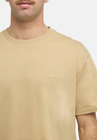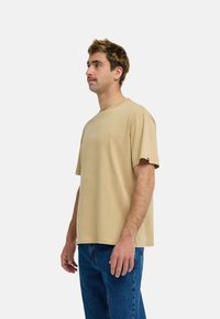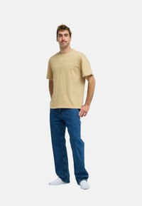 Muž s krátkymi vlasmi a fúzmi, oblečený v béžovom tričku s krátkym rukávom a modrých džínsoch, stojaci pred jednoduchým svetlým pozadím.