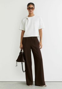 Biele tričko s krátkym rukávom z mäkkej látky, s uzlíkovým detailom na golieri a malým výstrihom. Kombinované s hnedými nohavicami.