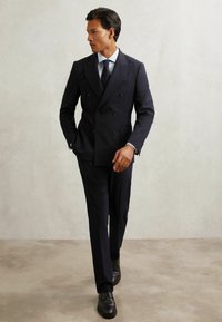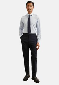 Pánsky formálny outfit: svetlomodrá pásikavá košeľa, tmavé upravené nohavice a čierne topánky. Košeľa má dlhé rukávy a štandardný golier.