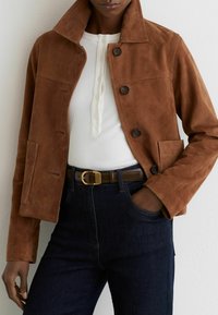 Hnedá semišová bunda s vystúpeným golierom, zapínaním na gombíky a dvoma vreckami, v kombinácii s bielym henley tričkom a tmavými džínsami.