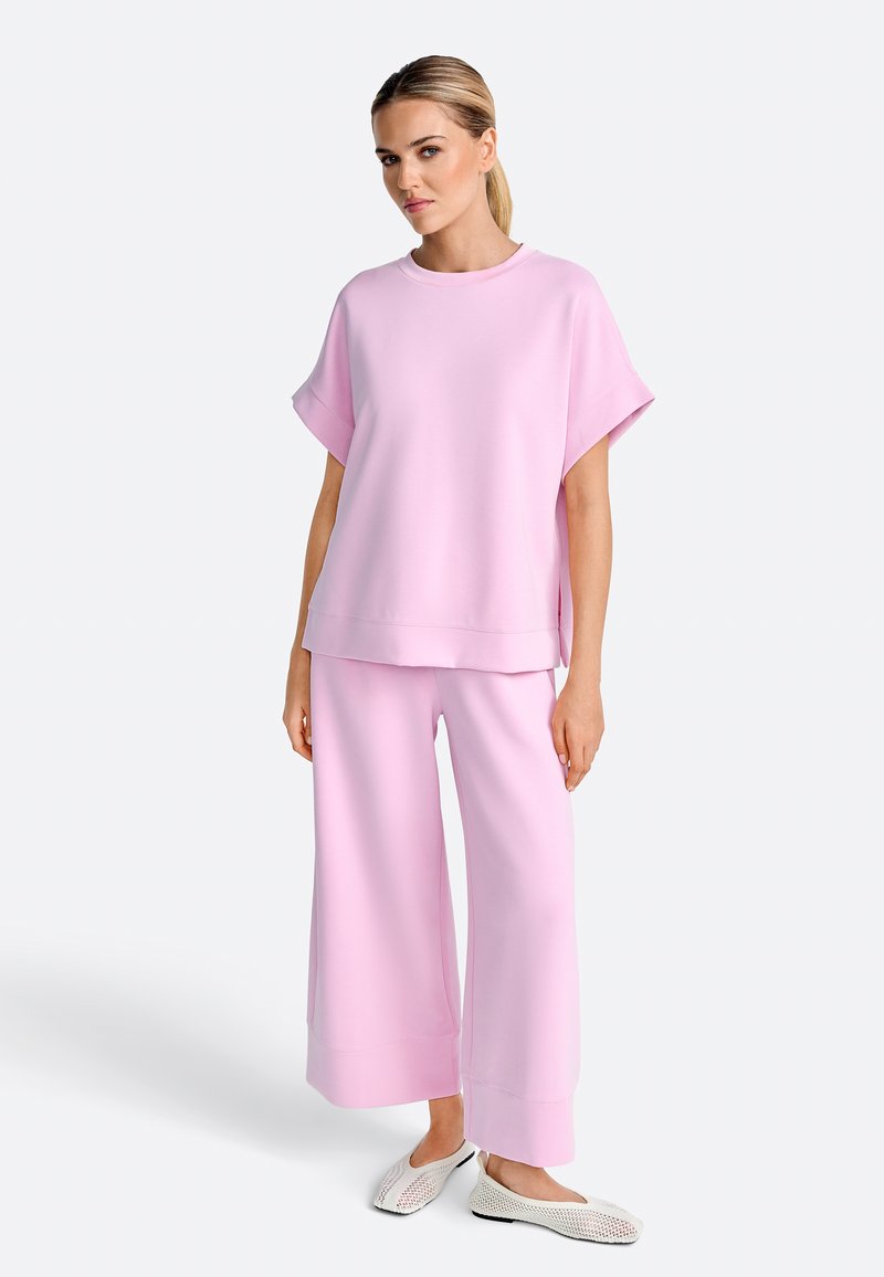 Žena stojaca, oblečená v voľnej pastelovo ružovej krátkym rukávom a voľných nohaviciach s bielymi sieťovanými slip-on topánkami.