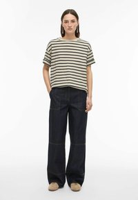 Žena s dlhými tmavými vlasmi, oblečená v béžovom a čiernom pruhovanom tričku, tmavomodrých rifliach a visiace strieborné náušnice, stojaca na bielom pozadí.