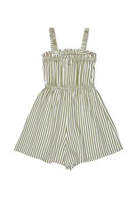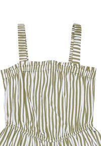 Zeleno-biely pruhovaný bezrukávový overal s elastickým pásom a ramienkami, položený na bielom pozadí.
