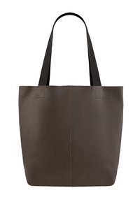 Tmavohnedá textúrovaná kožená taška na rameno s čiernymi textilnými rukoväťami, priestranným obdĺžnikovým telom a stredovým vertikálnym švom na prednej strane.