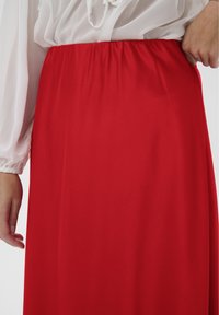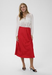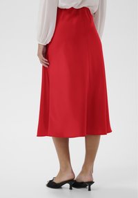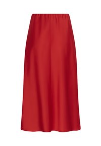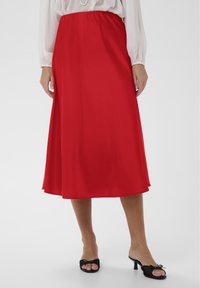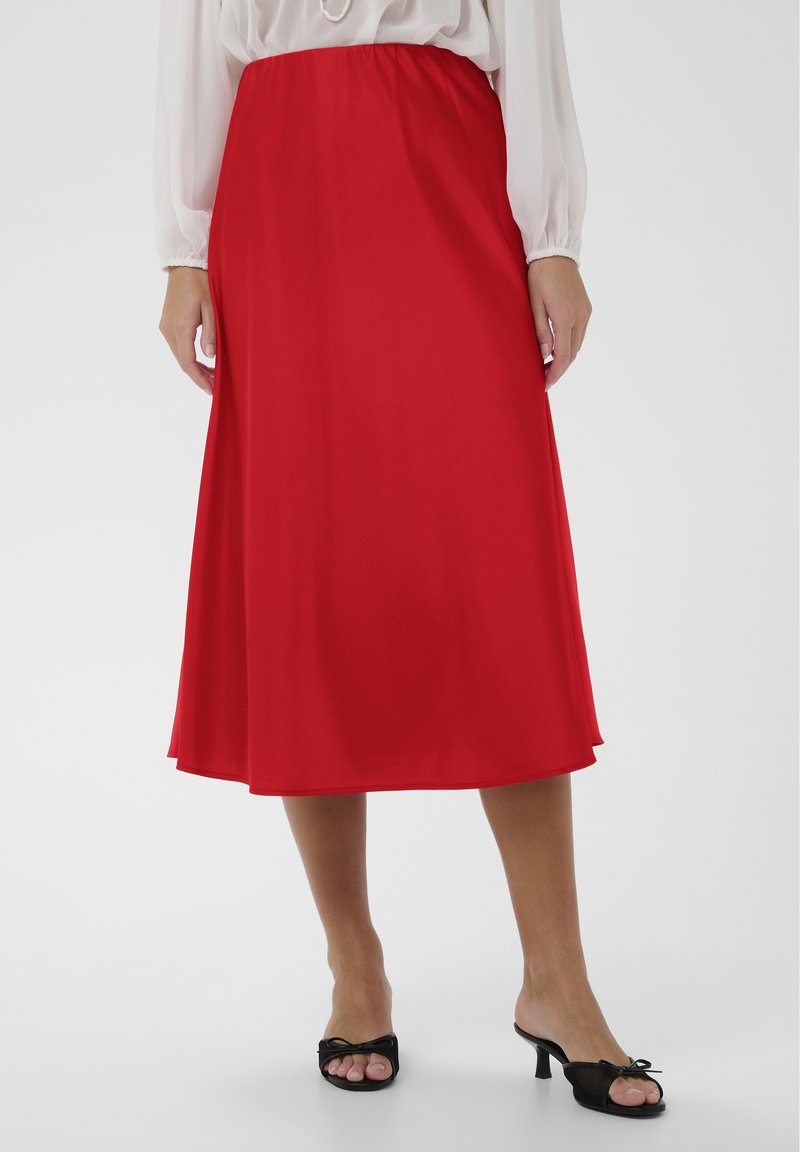 Červená midi sukňa s elastickým pásom, hladkou textúrou a jemným áčkovým strihom. Kombinovaná s čiernymi sandálmi na podpätku.