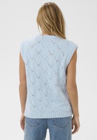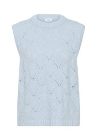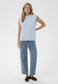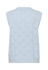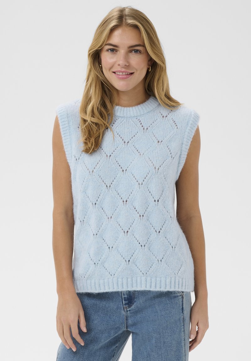 Mladá žena v svetlomodrom pletenom svetríku bez rukávov s diamantovými vzormi a modrých džínsoch, usmievajúca sa na jednotnom pozadí.