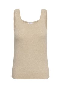 Béžové tielko z mäkkej látky, s okrúhlym výstrihom a širokými ramennými popruhmi. Jednoduchá textúra bez viditeľných vzorov alebo kovových prvkov.