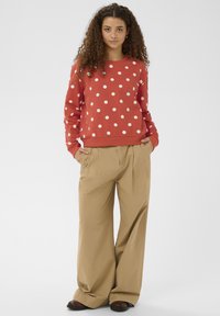 Červená mikina s bielymi bodkami, okrúhlym výstrihom a rebrovanými manžetami. Mäkká látka s voľným strihom, skombinovaná so svetlými nohavicami.
