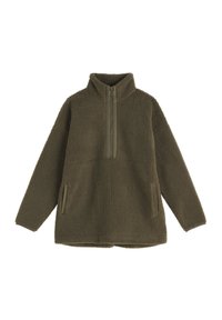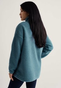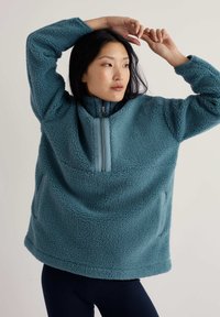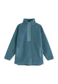 Modrý fleecový pulóver s polozipsovou západou, vysokým golierom a bočnými vreckami, s textúrovaným povrchom a voľným strihom.