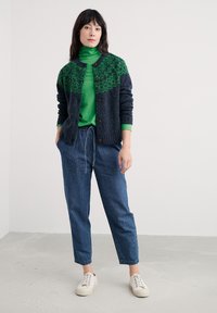 Zelený rolák s dlhými rukávmi z ľahkej textúrovanej látky, v kombinácii s modrými nohavicami na sťahovanie s voľným strihom a bočnými vreckami.