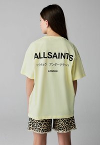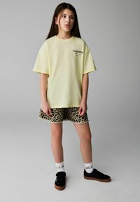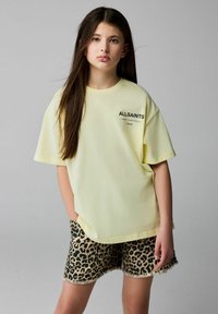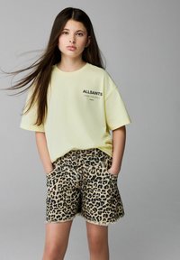 Mladé dievča stojí oblečené v svetložltom tričku AllSaints, leopardích kraťasoch, bielych ponožkách a čiernych teniskách na šedom pozadí.