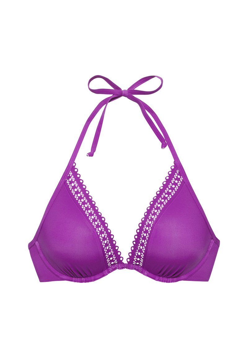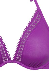 Purpurový horný diel bikín so šnúrkou na krku, s vystuženými košíčkami a ozdobnou čipkou pozdĺž výstrihu, zviazaný na mašľu na krku.