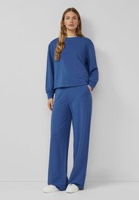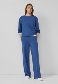 Modré nohavice s širokými nohavicami, nosené s bielymi teniskami a zodpovedajúcim modrým dlhým rukávom, zobrazené na stojacej osobe.