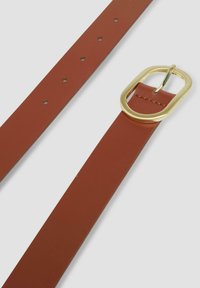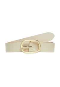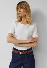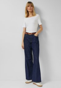 Biele tričko s krátkym rukávom a okrúhlym výstrihom, v kombinácii s tmavomodrými vysoko pásovými džínsami a hnedým opaskom so zlatou oválnou prackou.