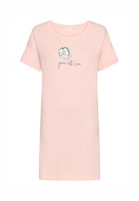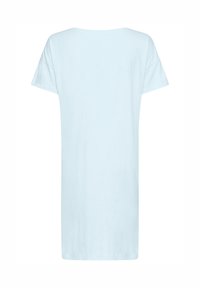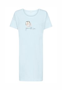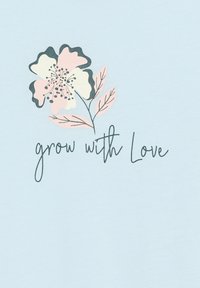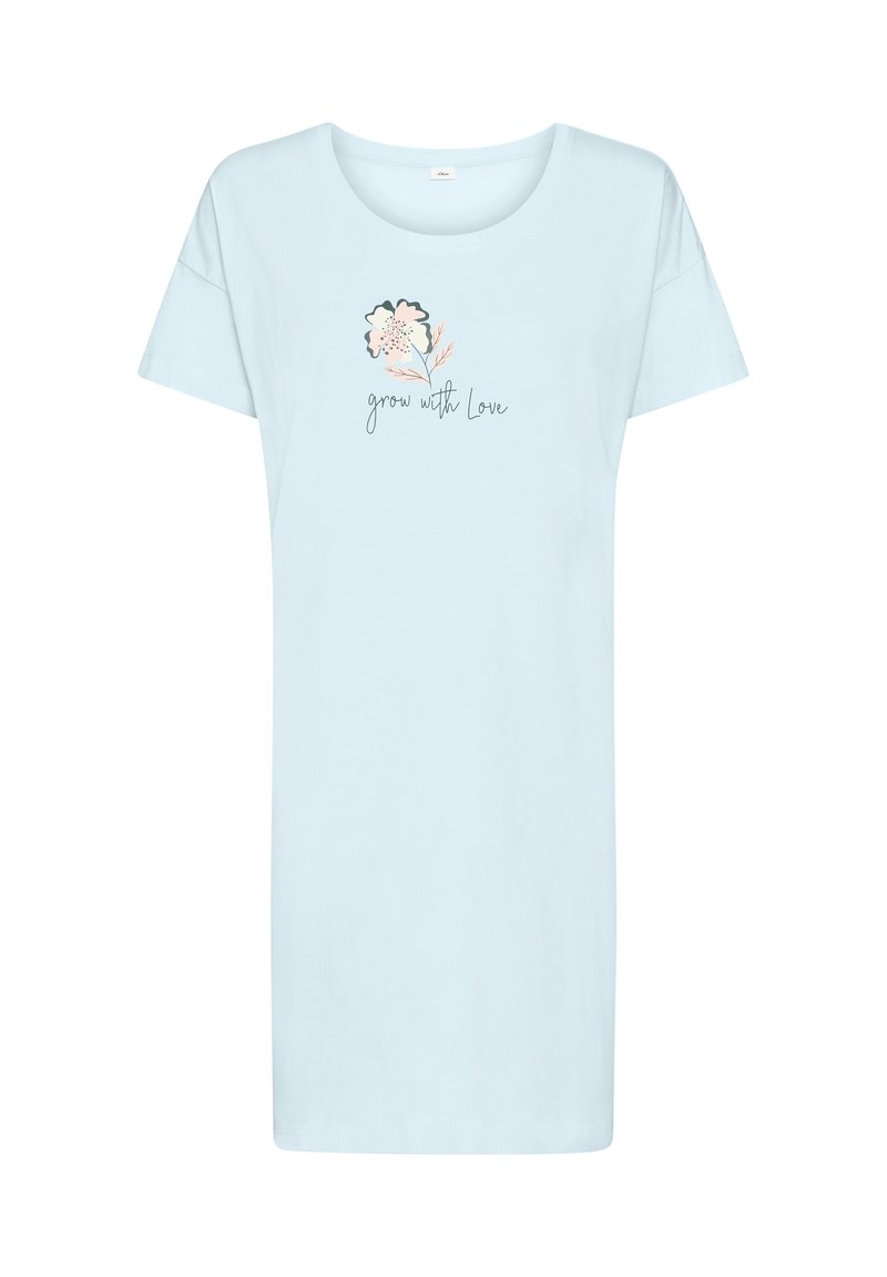 Svetlomodré krátke šaty s krátkym rukávom, okrúhlym výstrihom, kvetinovým motívom a nápisom „rastiť s láskou“ na hrudi.