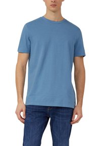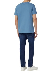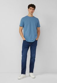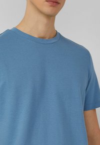 Modré tričko s krátkym rukávom vyrobené z mäkkej tkaniny s okrúhlym výstrihom a mierne textúrovaným povrchom, v kombinácii s tmavými džínsami.