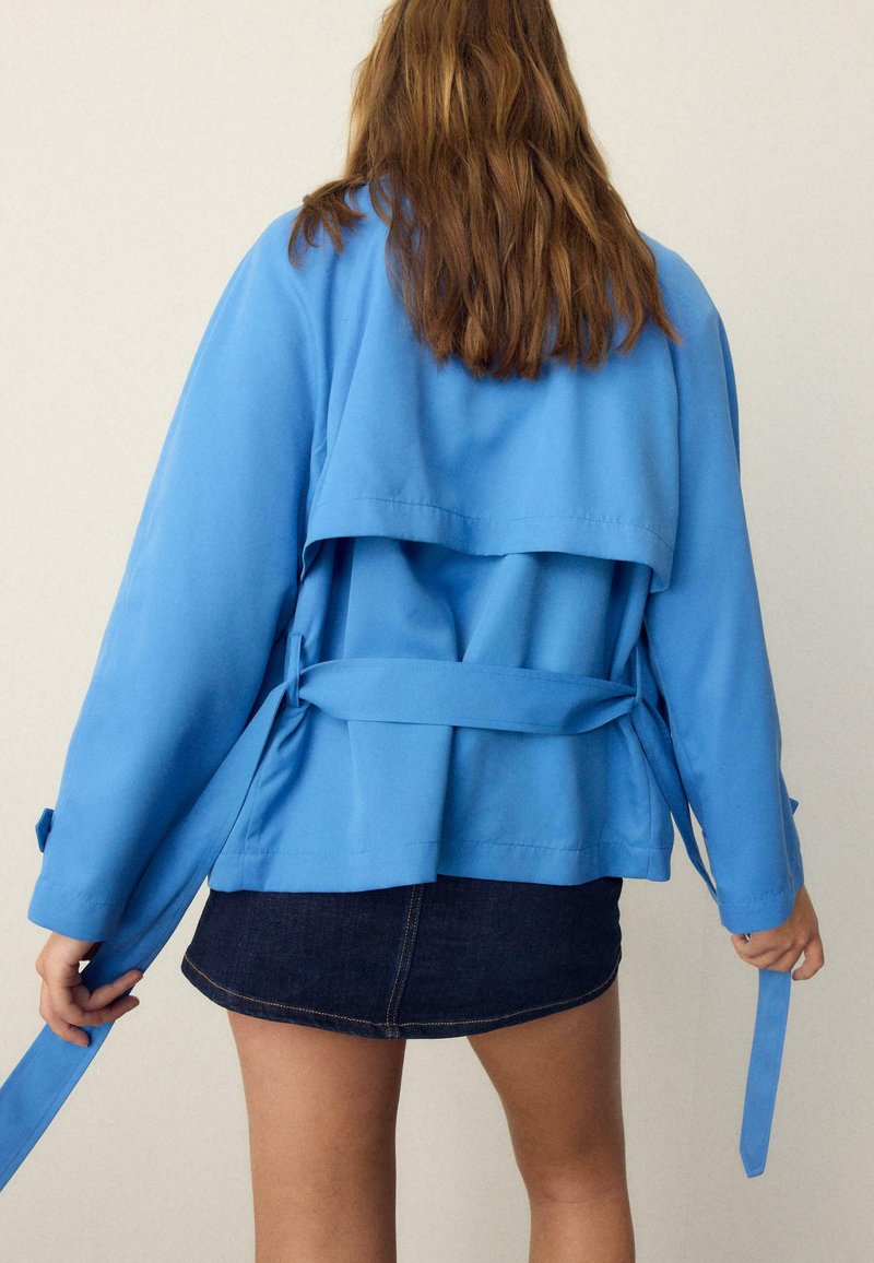 Žena s dlhými hnedými vlasmi, oblečená v modrej bunde s opaskom a tmavej rifľovej mini sukni, stojaca chrbtom k fotoaparátu.